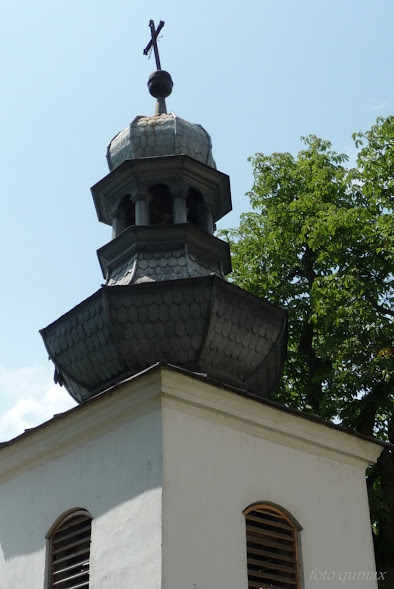 W narożnikach muru otaczającym kościół umieszczone są wieloboczne baszty pokryte dachami namiotowymi.